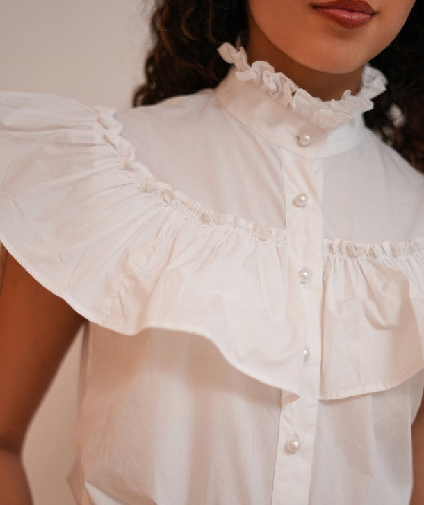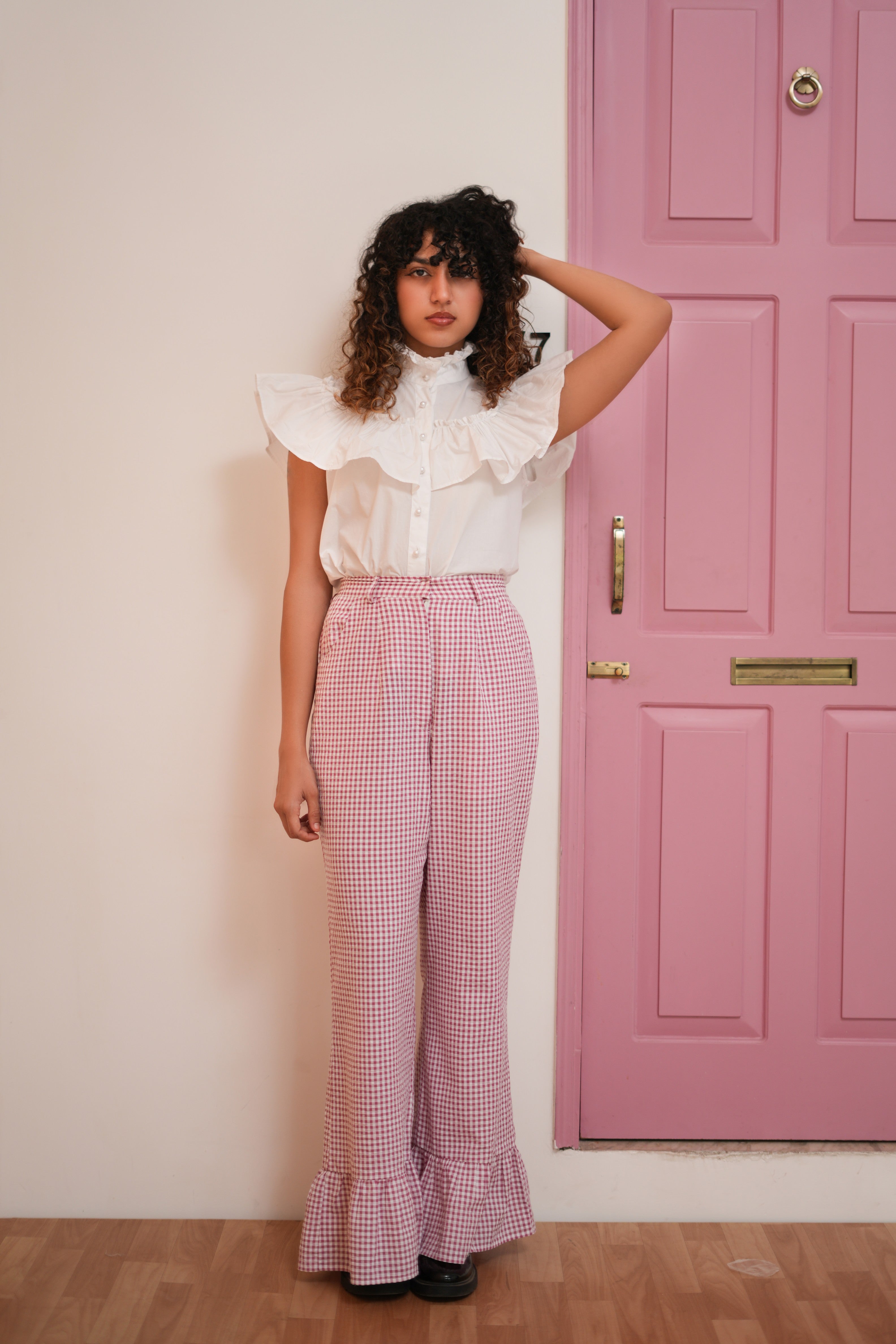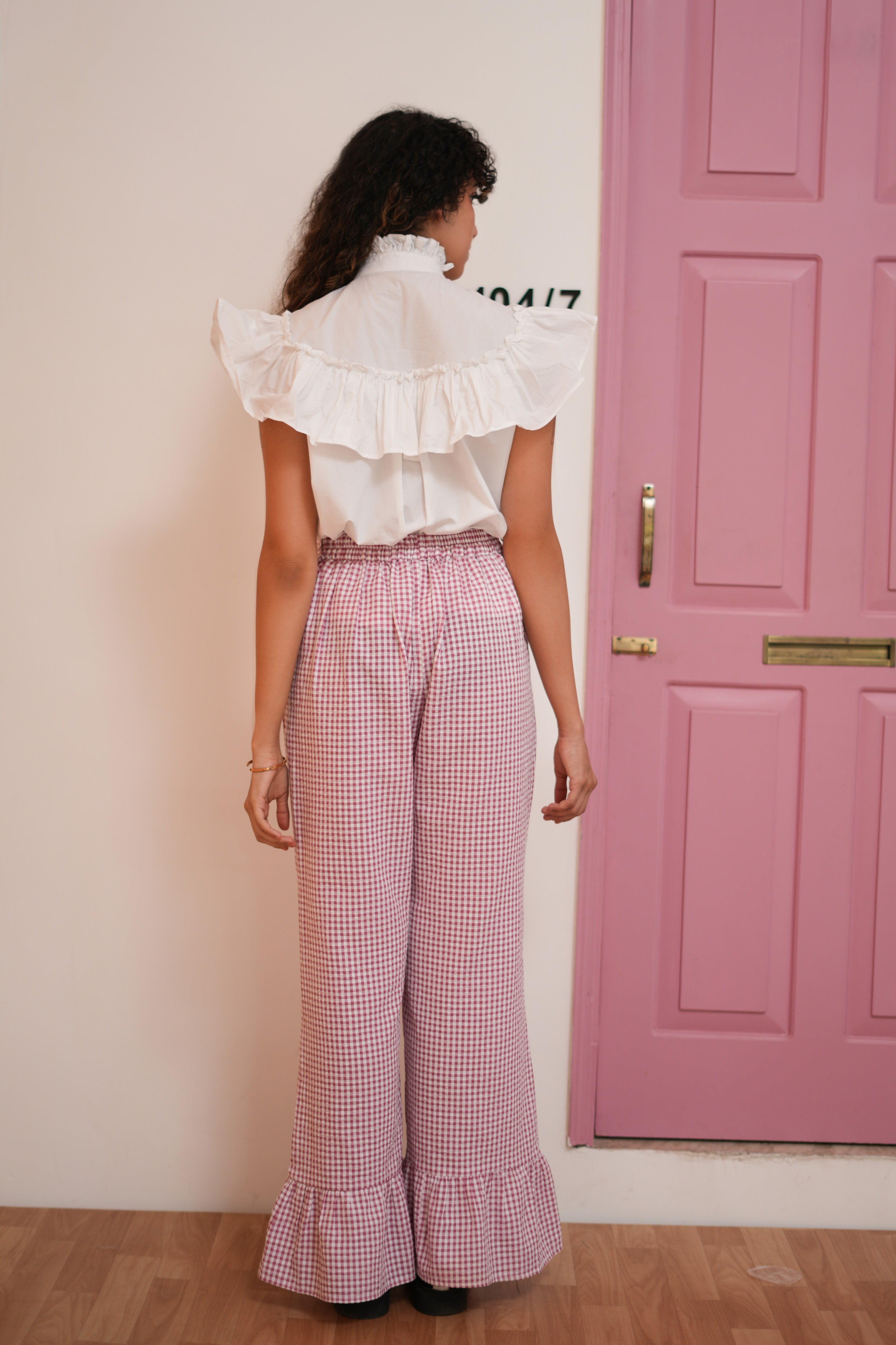 The Sora Set brings a modern twist to timeless gingham. Featuring a ruffled high-neck blouse with statement frills and tailored trousers that fall into soft ruffled hems, this set is equal parts polished and playful. Designed for days when you want comfort to carry a sense of occasion, it pairs whimsy with sharp detailing.